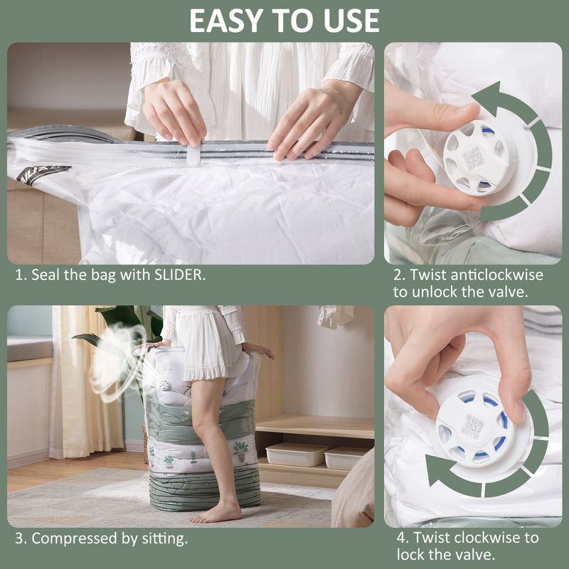 • Vacuum in the second-compression by sitting, easy to use The rotary switch design provides better sealing performance and is up to 3 times faster than traditional valves, sucking bags in seconds! Save more space and time for you.