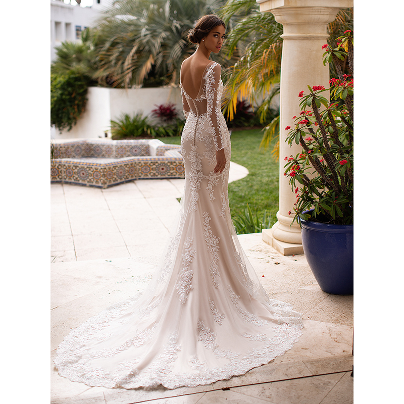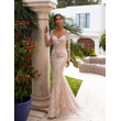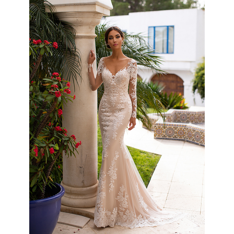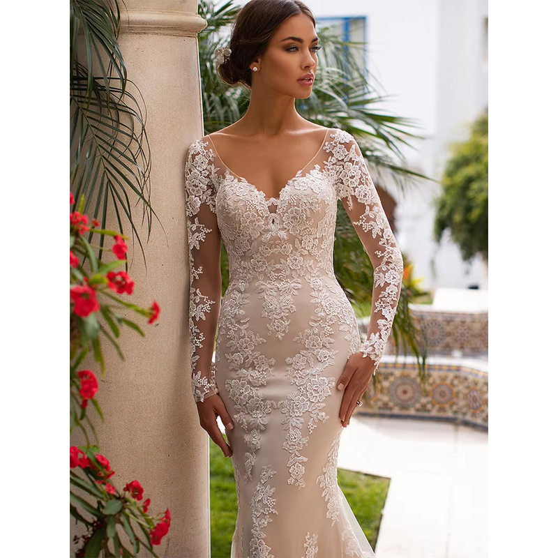 tailor shop custom made champagne wedding dress deep V-neck long-sleeved big was thin lace small trailing fishtail dress