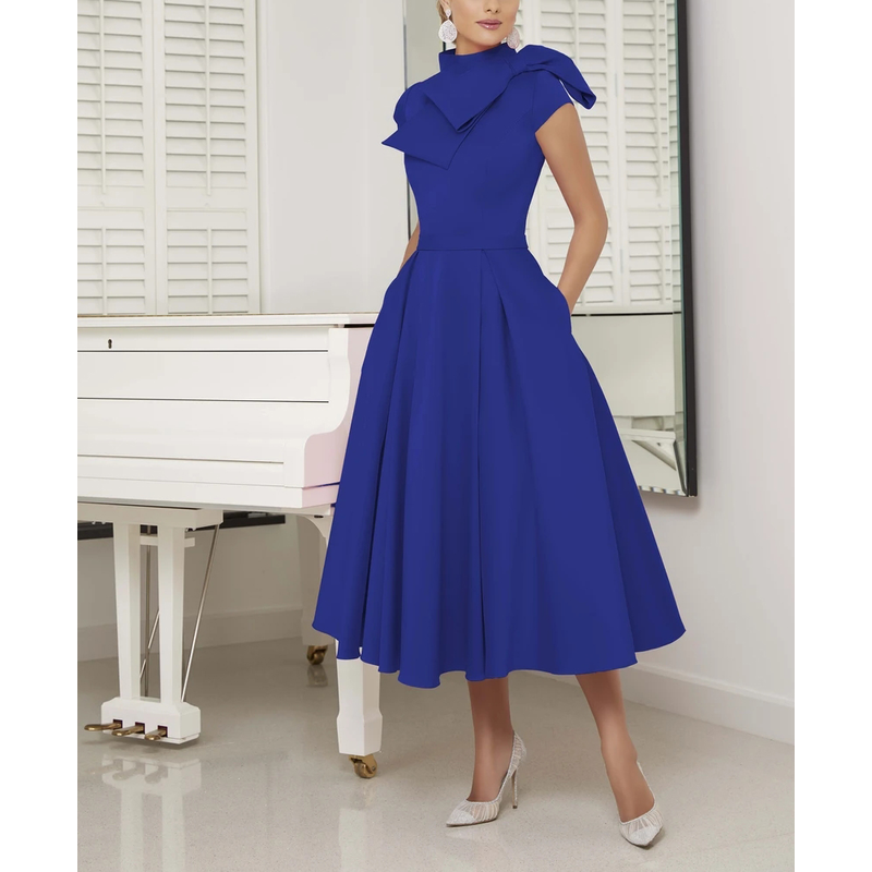 Less is definitely more. This eye catching dress uses the fabric and details for effect. The a-line dress has a oversized bow on shoulder next to a short collar.