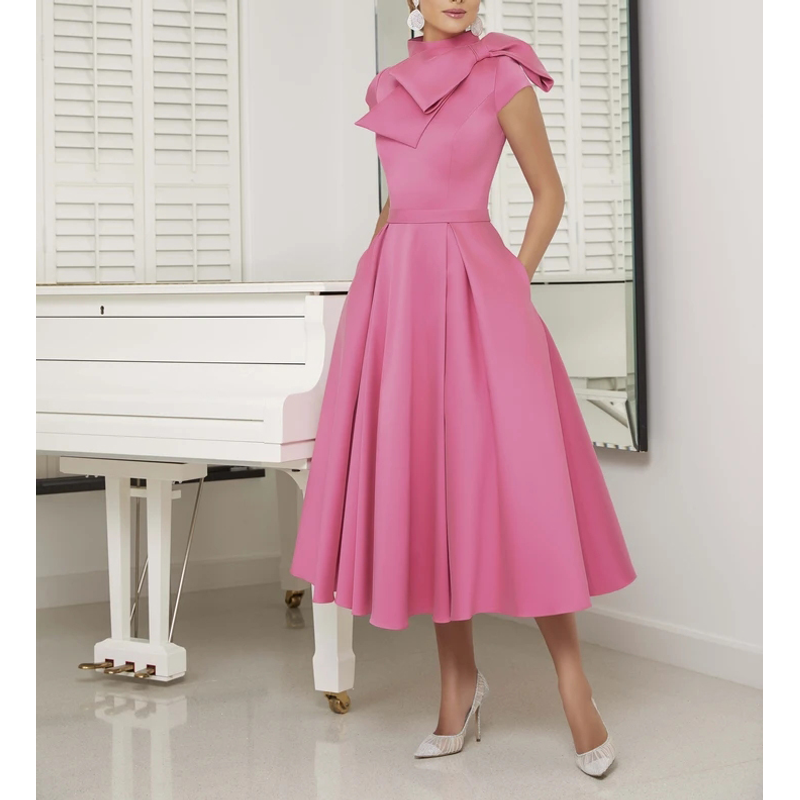 Less is definitely more. This eye catching dress uses the fabric and details for effect. The a-line dress has a oversized bow on shoulder next to a short collar.