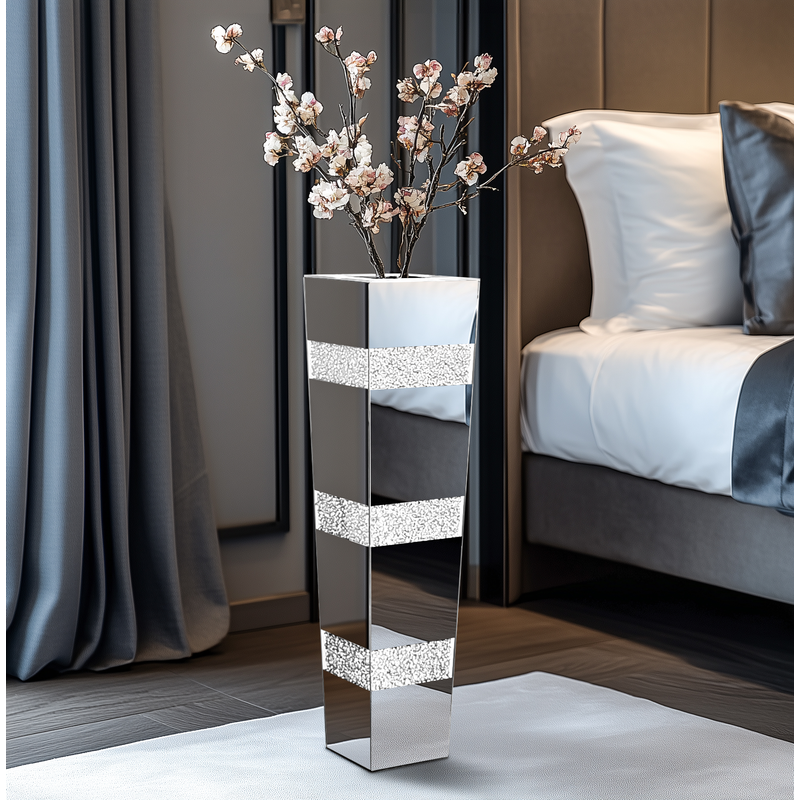 • Luxury tall floor vase with dazzling crushed diamond inlays and mirrored glass panels