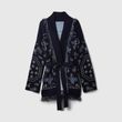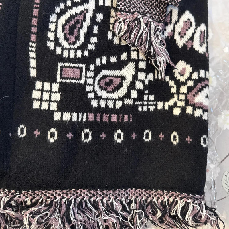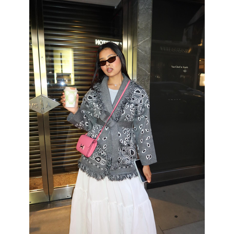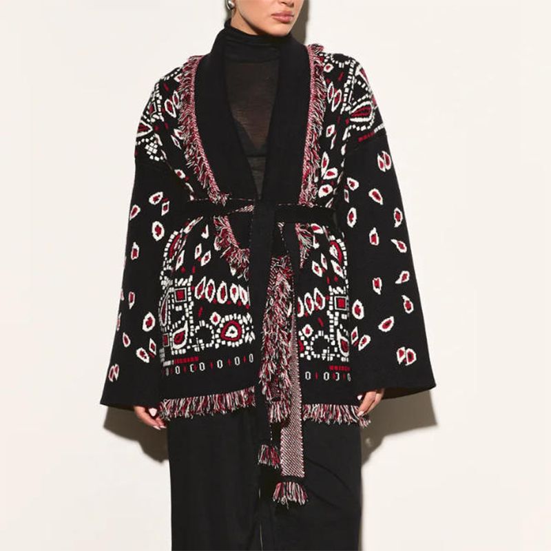 Tassel Patchwork Printed Cardigan Women Geometric Patterns Belts V-neck Long Sleeve Knitted Street Lady Sweater 2025 Autumn Coat