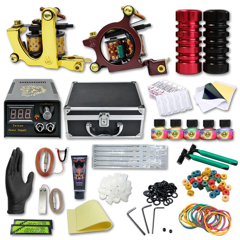 Professional tattoo machine*2Tattoo power supply*1Pure copper hook wire*1Stainless steel pedal*1Aluminum alloy handle*2Travel kit case*1 Professional tattoo needle*20 Disposable disinfection needle*20Professional transfer paper*1 Transfer Additive to gel*1 Vaseline*2 Silicone exercise skin*1