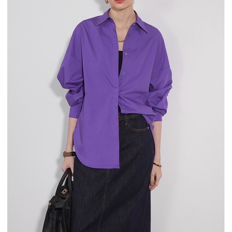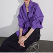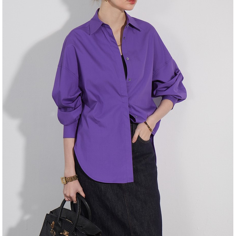 Temperament Casual Style Solid Color Polo Collar Straightness Relaxed Long Sleeve Shirt Purple M