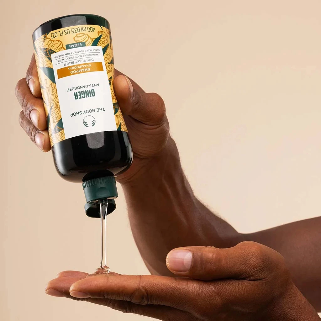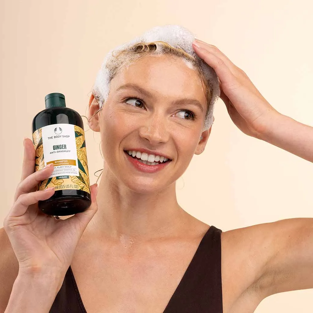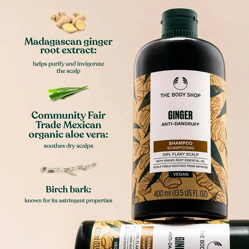 DescriptionThe Body Shop's Shampoo Anti-Dandruff Ginger is a powerful solution designed to combat dandruff while providing nourishment to your scalp. This 400ml shampoo harnesses the natural benefits of ginger, known for its soothing properties, to help reduce flakes and maintain a healthy scalp environment. Experience a refreshing cleanse that leaves your hair feeling revitalized and full of life.Key IngredientsGinger Extract: Renowned for its anti-inflammatory properties, ginger helps soothe the scalp and reduce irritation.Community Trade Honey: Provides moisture and nourishment, promoting healthy hair growth.Salicylic Acid: Gently exfoliates the scalp, helping to eliminate dandruff and flakes.BenefitsEffective dandruff control: Targets and reduces visible flakes.Soothes the scalp: Calms irritation and promotes overall scalp health.Revitalizes hair: Leaves hair feeling clean, soft, and manageable.Natural ingredients: Formulated with ethically sourced ingredients, ensuring a gentle touch.How to UseApply a small amount of Shampoo Anti-Dandruff Ginger to wet hair. Gently massage into the scalp and work through the lengths of your hair. Rinse thoroughly and repeat if necessary. For best results, follow with your favorite conditioner.Suitable ForThis shampoo is suitable for all hair types and is ideal for individuals experiencing dandruff and scalp irritation. It is perfect for those looking for a natural solution to maintain a healthy scalp and beautiful hair.Additional InformationEach bottle contains 400ml of the Shampoo Anti-Dandruff Ginger, making it a great addition to your hair care routine. The Body Shop is committed to sustainability and ethical sourcing, ensuring that you can feel good about your purchase