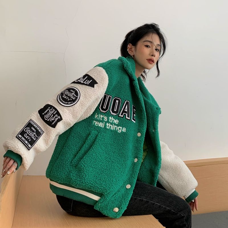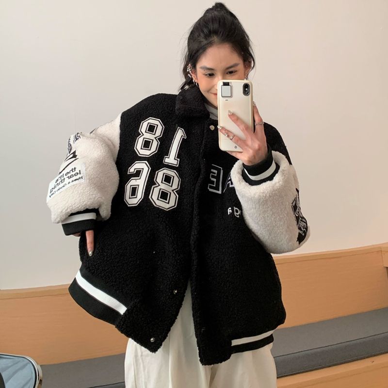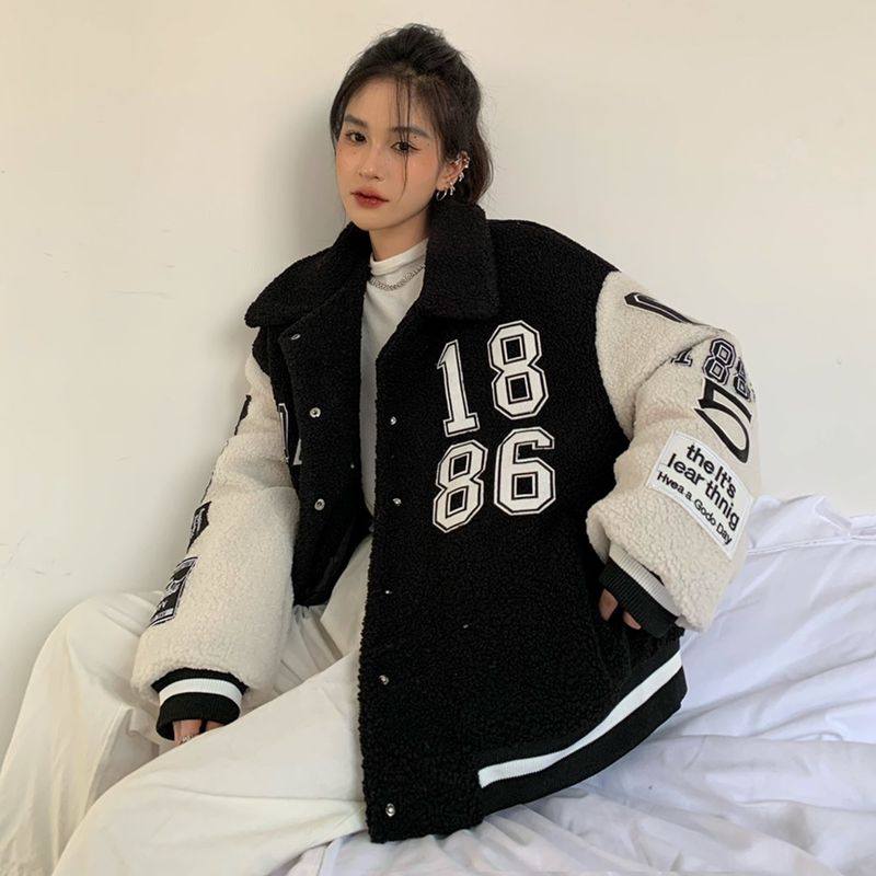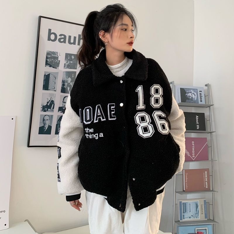 Thickened Warm Lamb Wool Embroidered Cotton Coat Black L