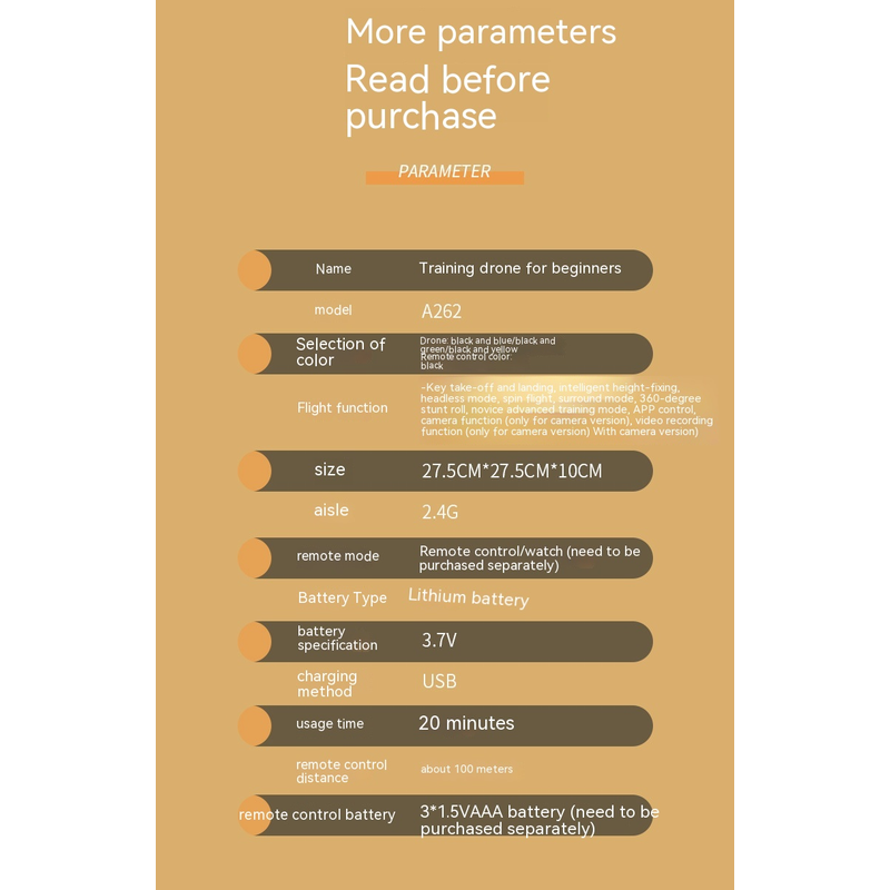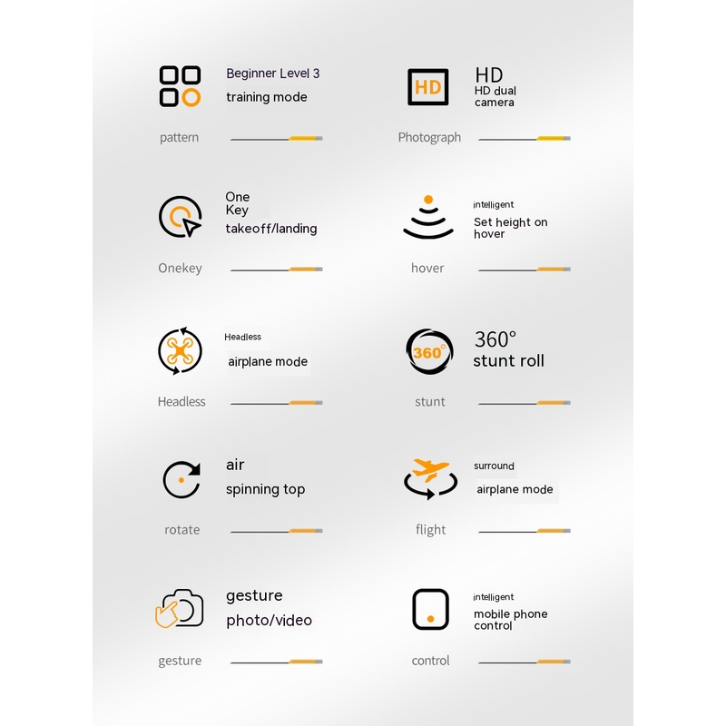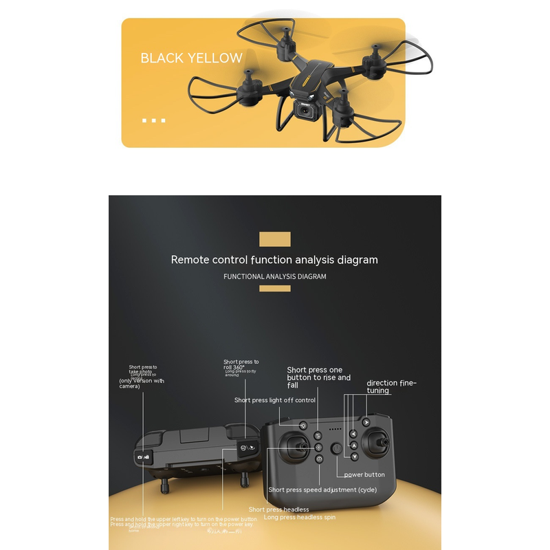 Function description: Without camera: forward, backward, left turn, right turn, left wing, right wing, one click takeoff and landing, fixed altitude, headless mode, spin flight, surround mode, 360 degree stunt roll, beginner advanced training mode