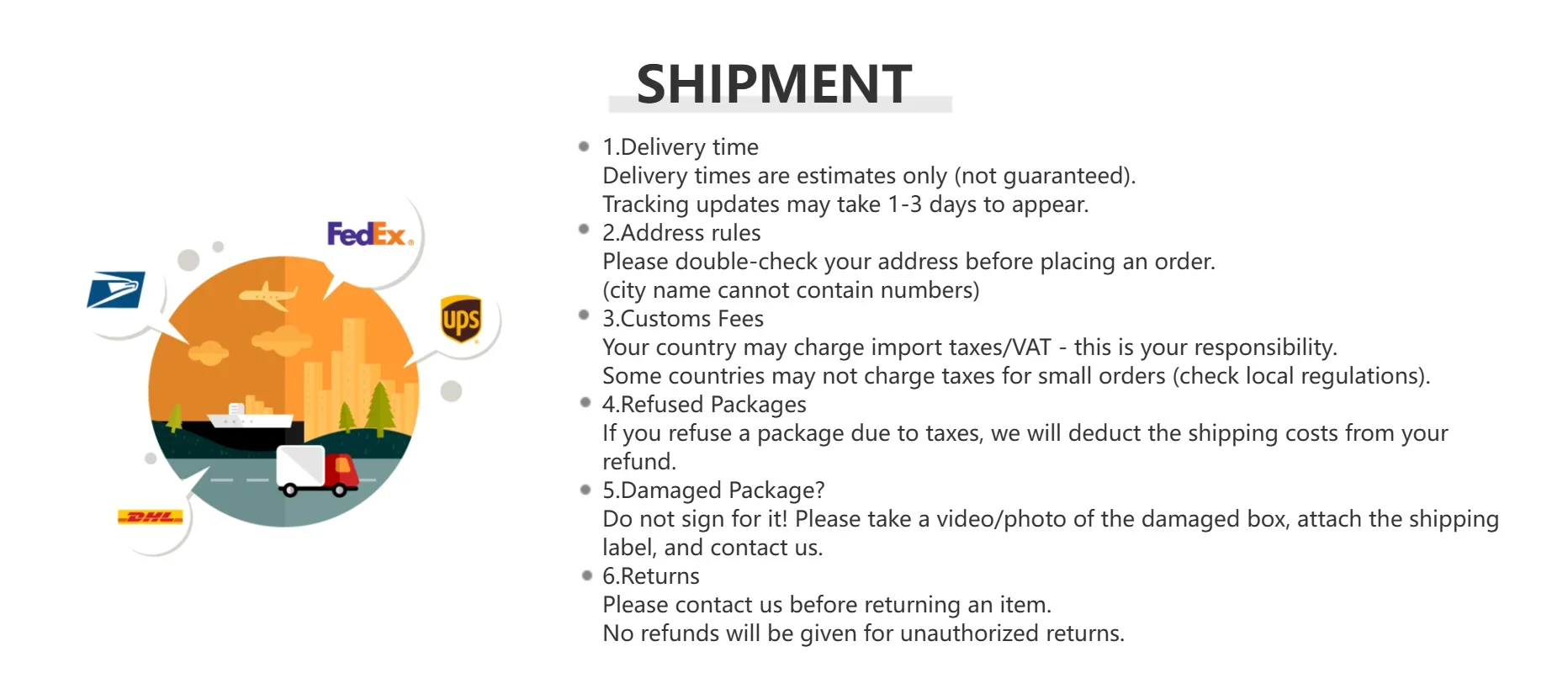 Please note that delivery times are estimates and may vary due to customs procedures, carrier delays, weather conditions, or other unforeseen circumstances.