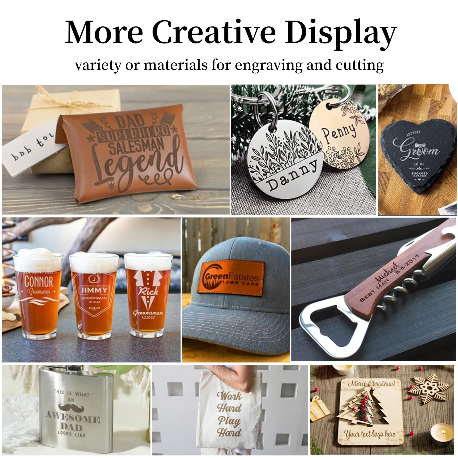 Engreving MaterialsWood, paper, plastic, leather, bamboo, kraft paper, painted metal, sponge paper, black acrylic, glass (need to be painted black), ceramic (need to be pasted with colored paper), etc.