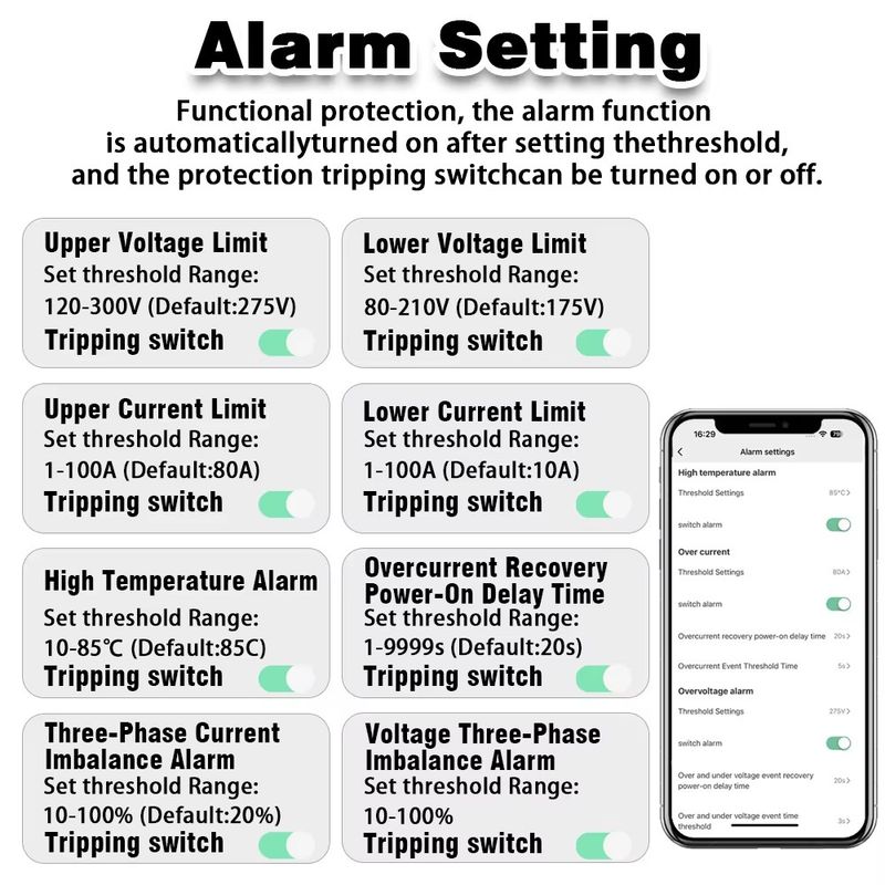 2.Lower Voltage Limit:80-210V (Adjustable) (Default:175V)
