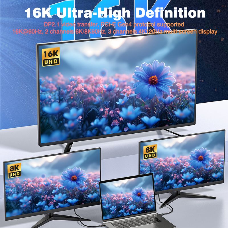 Supports 2*7680x4320(8K)12-bit HDR@60Hz; 2-channel 6144x3456(6K)12-bit HDR@60Hz;3 channels 4096x2160(4KDC1)@120Hz; Also supports DP2.1 [16K@60Hz/12K@60HZ]And it supports other low resolutions - high refresh rates downward