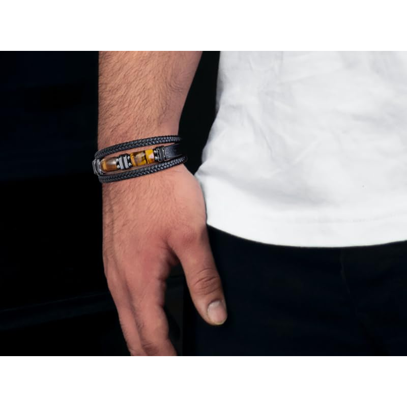 ✅【Black Leather Bracelet】Using leather and natural tiger eye stone with a black classic design, through the trend of the time, more to be remembered.