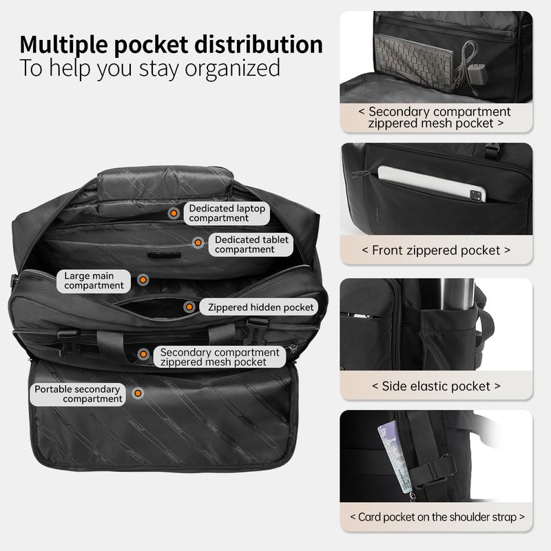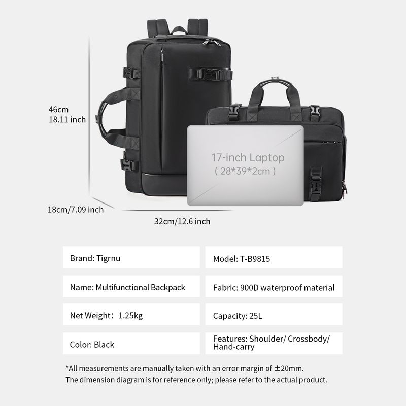 4. 25L large capacity design & Muti-functional pockets: main compartment, 17 inch laptop shock-proof compartment, zipper mesh bag, etc ;