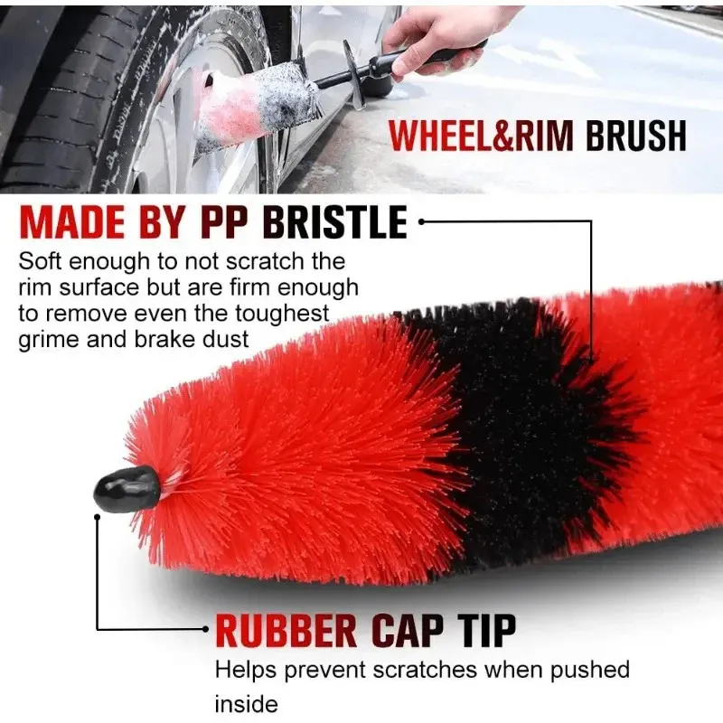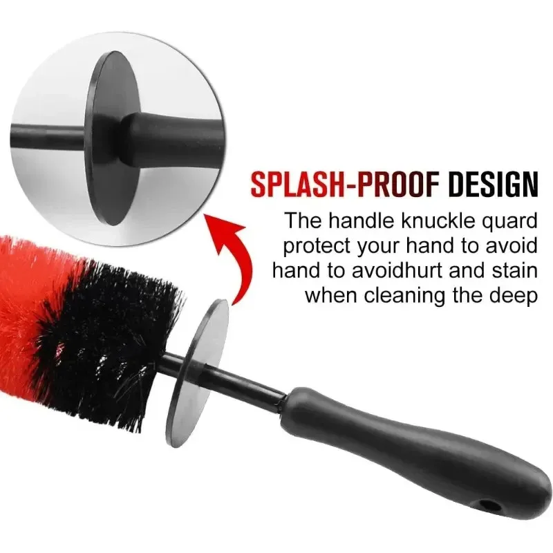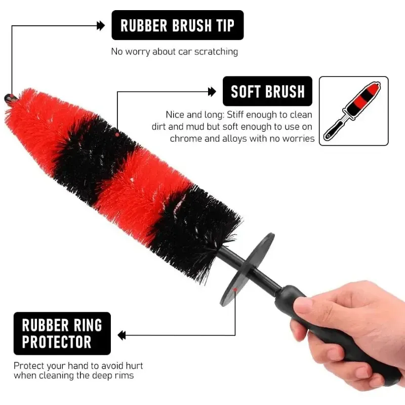 No worry about car scratchingSOFT BRUSHNice and long: Stiff enough to clean dirt and mud but soft enough to use on chrome and alloys with no worriesRUBBER RING PROTECTORProtect your hand to avoid hurt when cleaning the deep rims