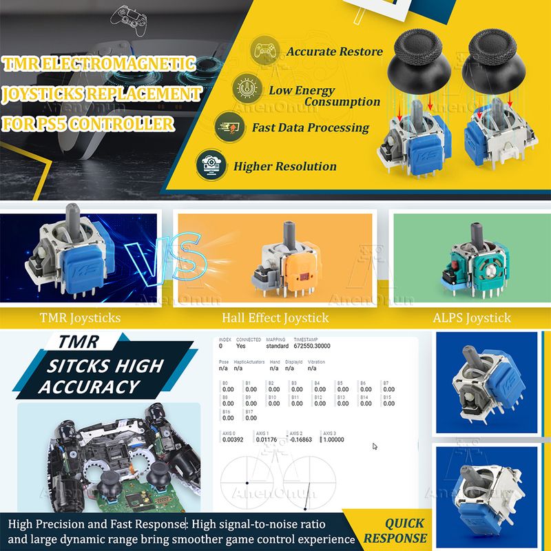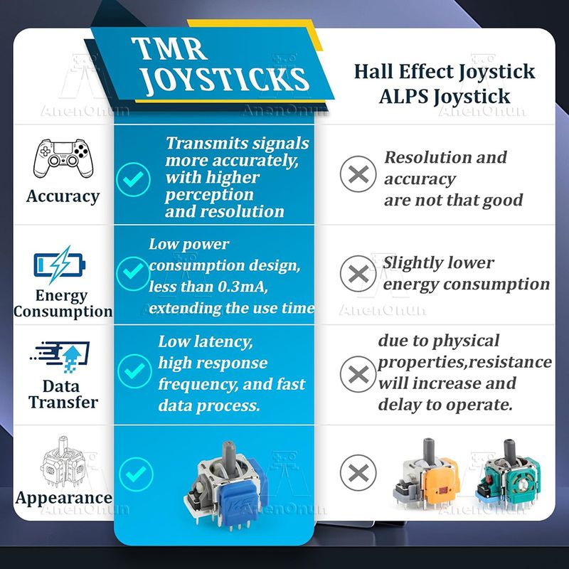 🔥🔥🔥【Advantages of TMR Electromagnetic Joystick】- Compared with traditional carbon film joysticks, TMR joysticks have the high life and non-drift characteristics of Hall joysticks, and at the same time have the high accuracy and low power consumption of carbon film joysticks. It has higher sensitivity and resolution, and the feedback accuracy can reach millimeter level, which fundamentally solves the joystick drift problem.
