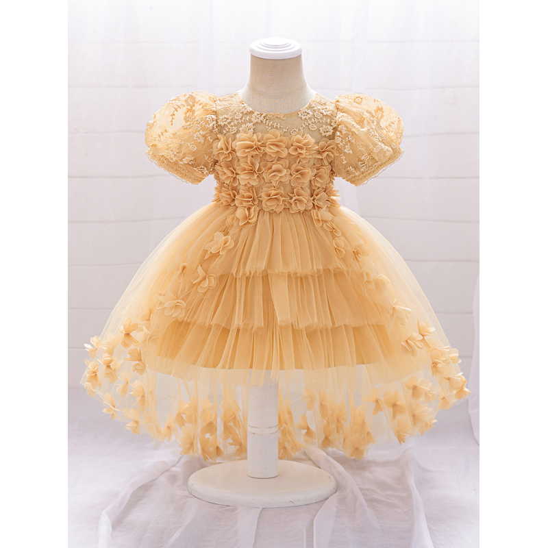 Toddler Girls 1st Birthday Princess Dresses Puff Sleeve Trailing Flower Girl Dress Tulle Puffy Baby Party Wedding Ball Gown 0-3Y