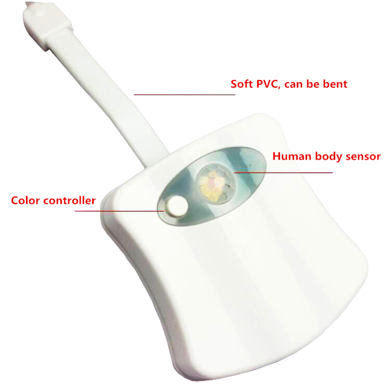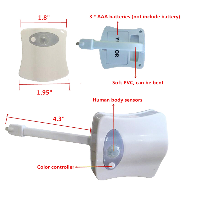Human body induction toilet night light (suitable for any toilet) Style: Modern light source: LED material: ABS plastic voltage: 4.5 volts power: 1-watt battery: 3 AAA batteries are required. (Product does not bring its own battery) Special features: Motion sensor power: battery powered motion sensing \ light-sensitive suitable for any toilet! Hygienic design: easy to clean set to the color rotation (8 colors 120 seconds each color random 15 seconds can also fix a color)