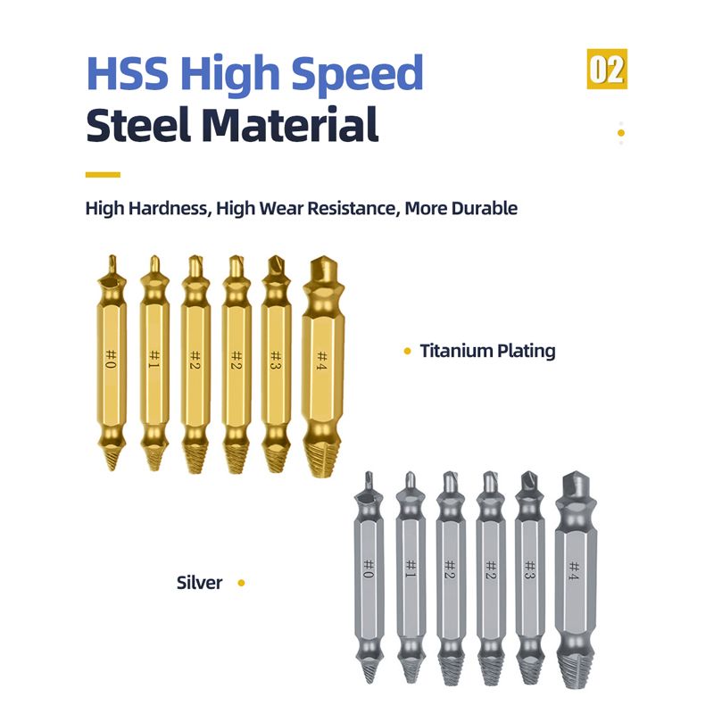 The screw extractor is made of 4341 material with a hardness of about 58-60. It can be used for most iron and ordinary steel screws. If the screw you want to take out is a material with higher hardness such as stainless steel, it may not be drilled or slipped during use.