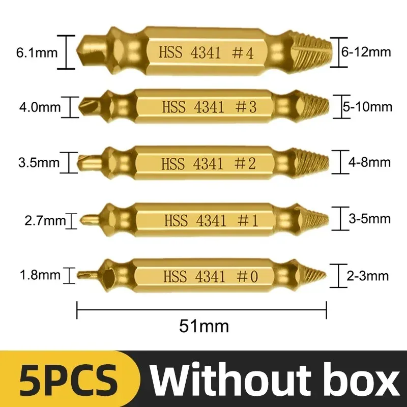The screw extractor is made of 4341 material with a hardness of about 58-60. It can be used for most iron and ordinary steel screws. If the screw you want to take out is a material with higher hardness such as stainless steel, it may not be drilled or slipped during use.