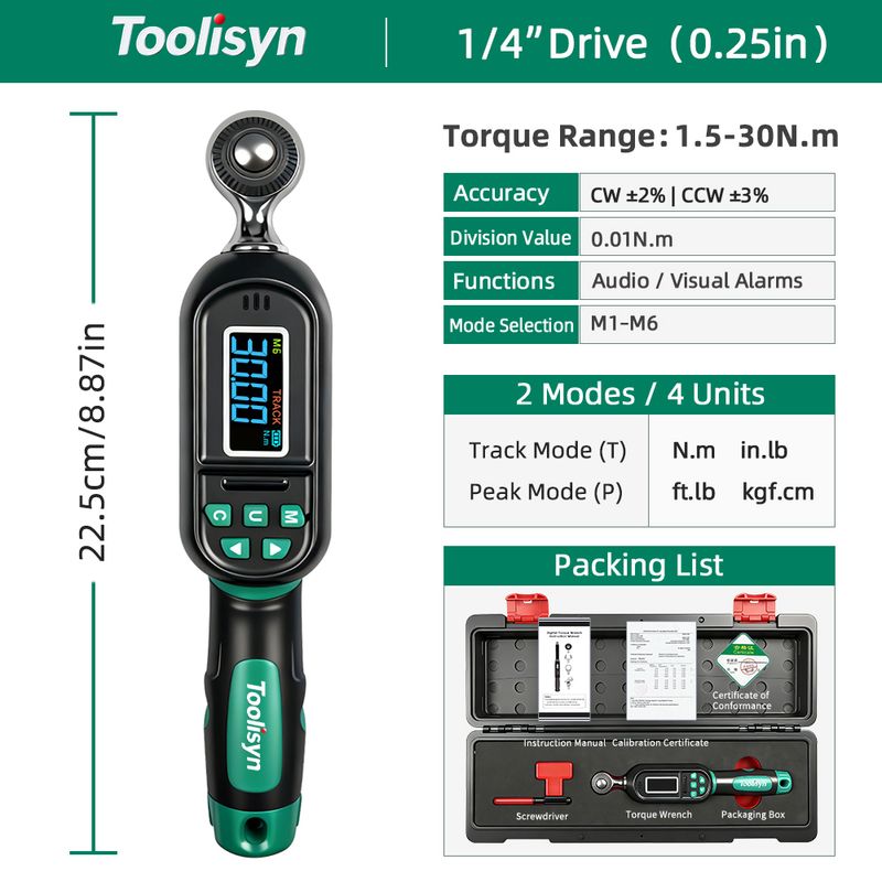 Toolisyn Digital Torque Wrench 0.3-500N.m Adjustable1/4"3/8"1/2"Drive±2% Accuracy LED Buzzer Precision Tool for Bike Car Repair