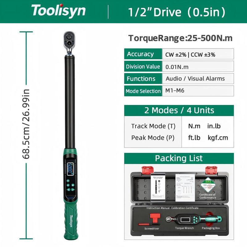 Toolisyn Digital Torque Wrench 0.3-500N.m Adjustable1/4"3/8"1/2"Drive±2% Accuracy LED Buzzer Precision Tool for Bike Car Repair