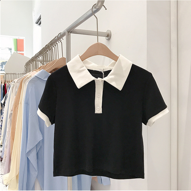 Top Solid Color Polo Shirt Lapel Short High-waist Short-sleeved T-shirt Black L