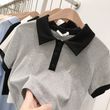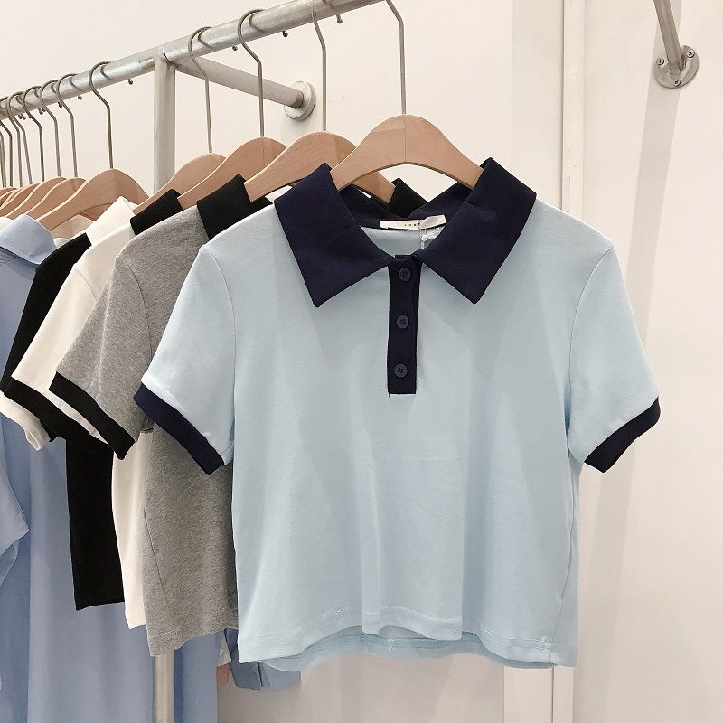 Top Solid Color Polo Shirt Lapel Short High-waist Short-sleeved T-shirt Light Blue L
