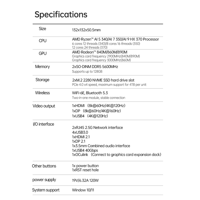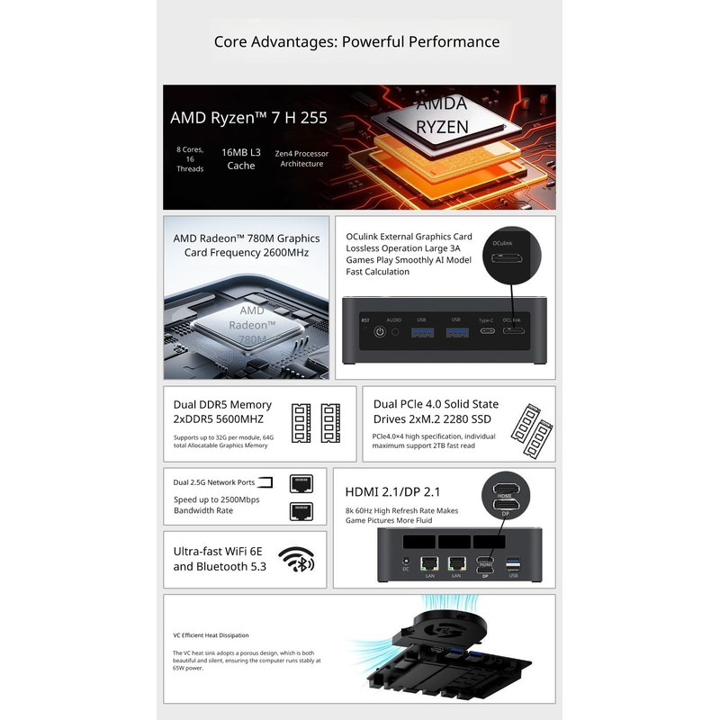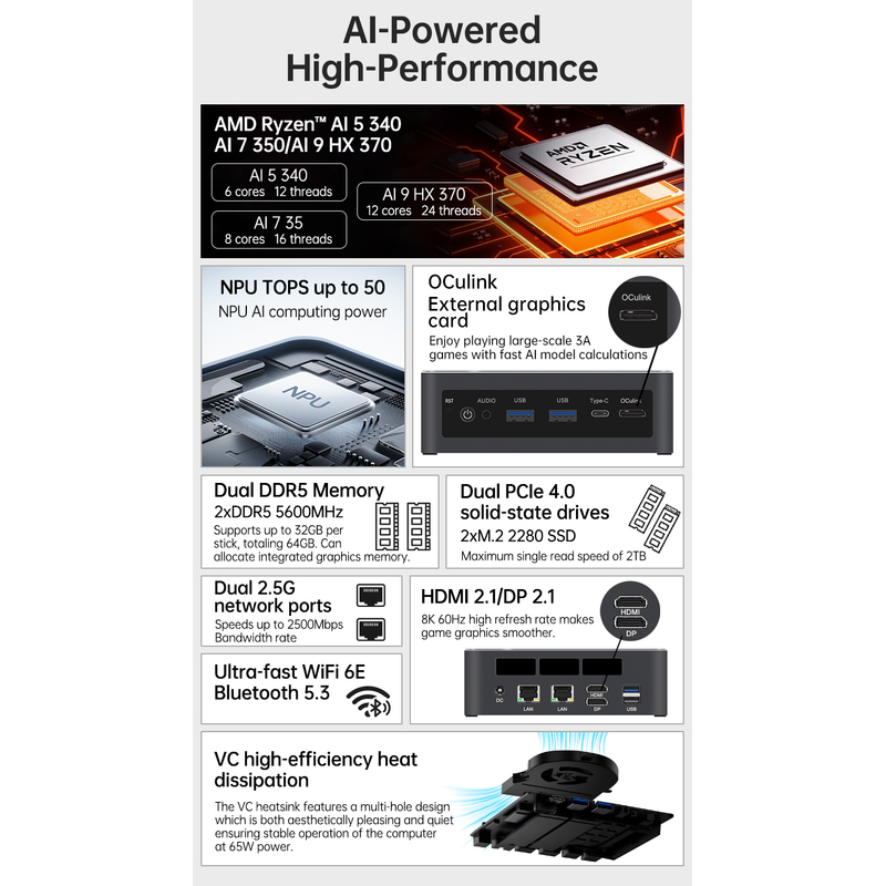 TOPC AMD AI 255 AI7 Pro 360 AI9 365 AI9 HX370 Mini PC DDR5 NVMe SSD WiFi6E BT5.3 Gaming Computer