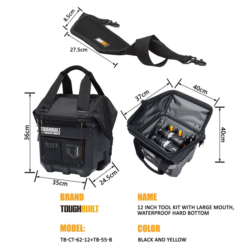 TOUGHBUILT 12 inch/16 inch/20 inch large opening waterproof hard bottom tool kit, zipper sealed, storage bag TB-CT-62-12/16A/20