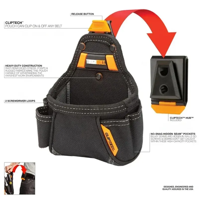 The ToughBuilt TB-CT-25 pouch features a No-Snag Hidden Seam pocket, preventing accidental snags and keeping your tools secure.