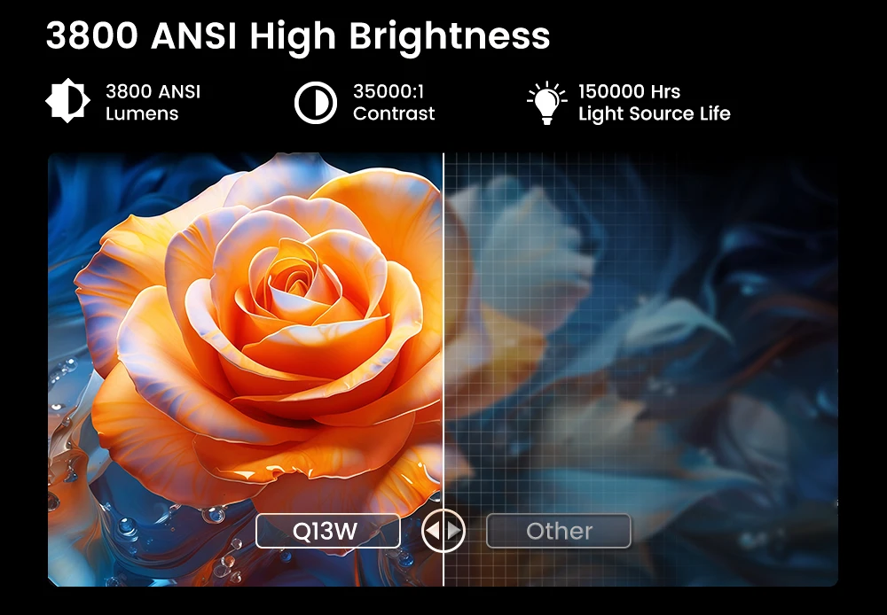 New enclosed optical engine leads the trend of the times and reduces dustHD interface version 2.1 vs. version 1.4Q13W vs. Q12W PRO: Using a brand new upgraded chip motherboard with more complete functions and more advanced technologyThe 3800ANSI high-brightness translucent screen allows you to truly experience the use of scenes regardless of day or night, effectively reducing eye irritation when using in dark environmentsThe new Android 15 system brings you different visual effects and functional experienceAuto focus, auto keystone, auto screen Alignment, auto obstacle avoidanceMultiple modes to adjust the machine: standard mode, high brightness mode, low noise mode, custom mode3*12W stereo speakers bring you the pinnacle of sound qualityThe latest HI3751 V660-A55 chip takes you into the technological era and experiences the pleasure brought by technology.The latest HDR10 technology supportThe latest MEMC technology supports you to enjoy the game, and the game mode delay address is 20MSThe projector with 3800ANSI brightness can be used in multiple scenes, so you don't have to worry about being affected by bright environments.LAN*1 HD*1 USB*2  Aduio*1(If the HD interface is not enough, you can shoot and HD products)