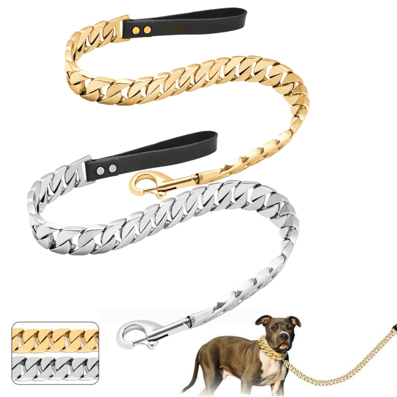 Who needs this leash? : Do you have a dog that likes to bite? If so, then this collar is perfect! The deluxe Cuban chain leash looks cool on both male and female dogs. 32mm wide, 24" to 48" long, can be used with stainless steel metal collars. For large active breeds such as Rottweilers, Pit Bulls, American Bulldogs, German Shepherds, Huskies, Newfoundlands, Belgian Malinois, Saint Bernards and English Bulldogs, it can handle rough Variety.