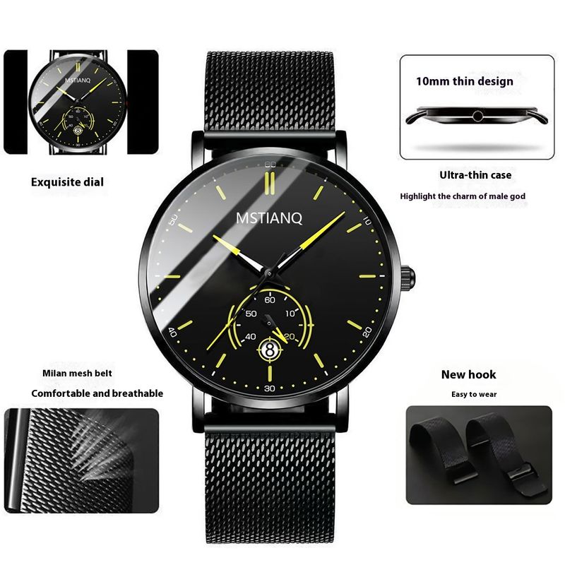 Trade Watch Stylish Black Technology Belt Refined Steel Korean Casual Calendar Mesh Belt Yellow Plate