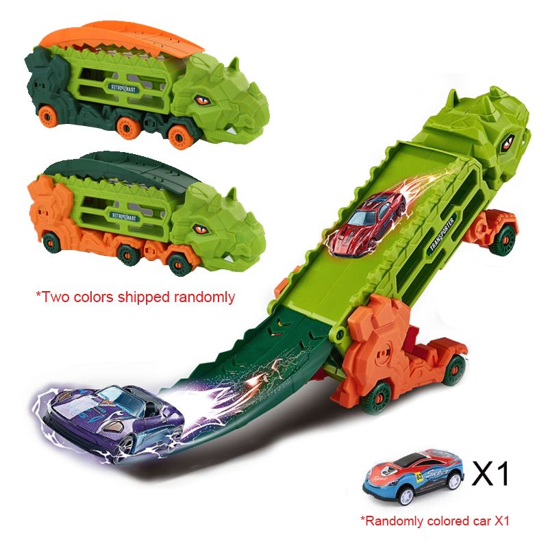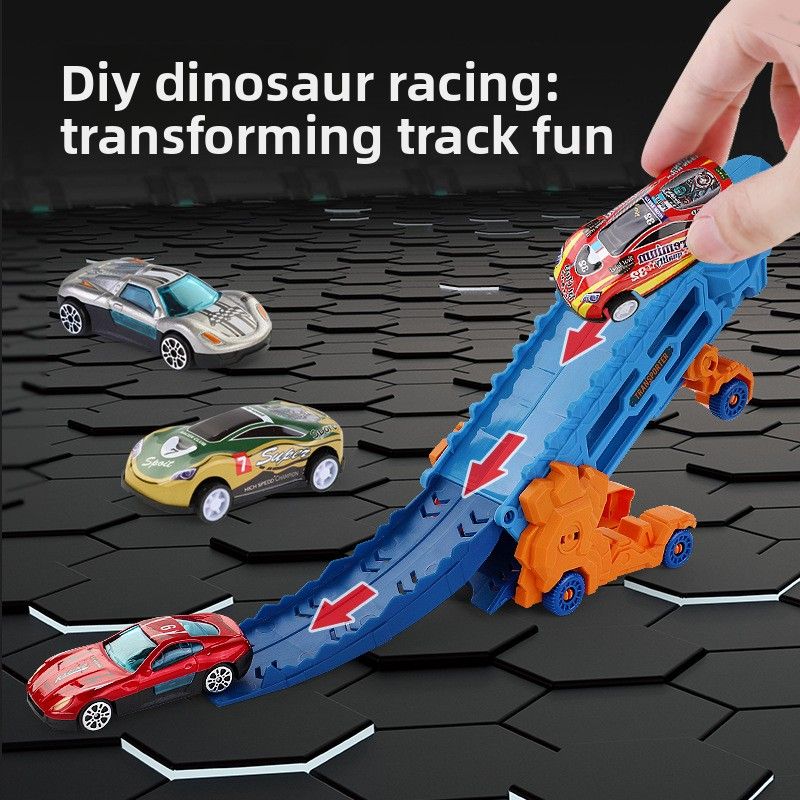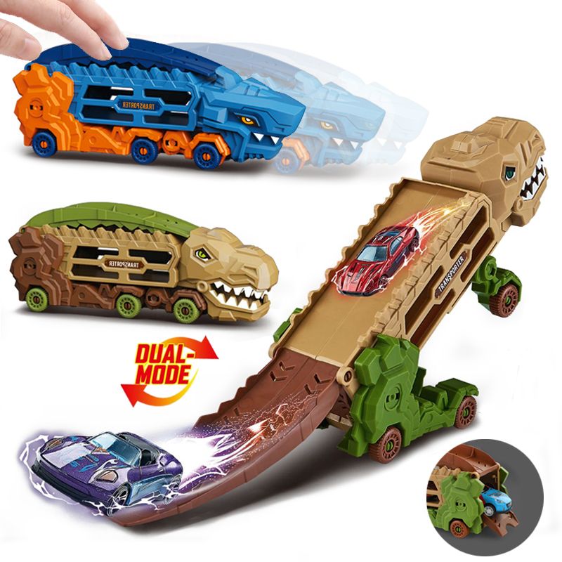 Transport Dinosaur Truck with Foldable Sliding Race Track, Transforms into Standing T-Rex & Trike, Best Birthday Gift for Kids