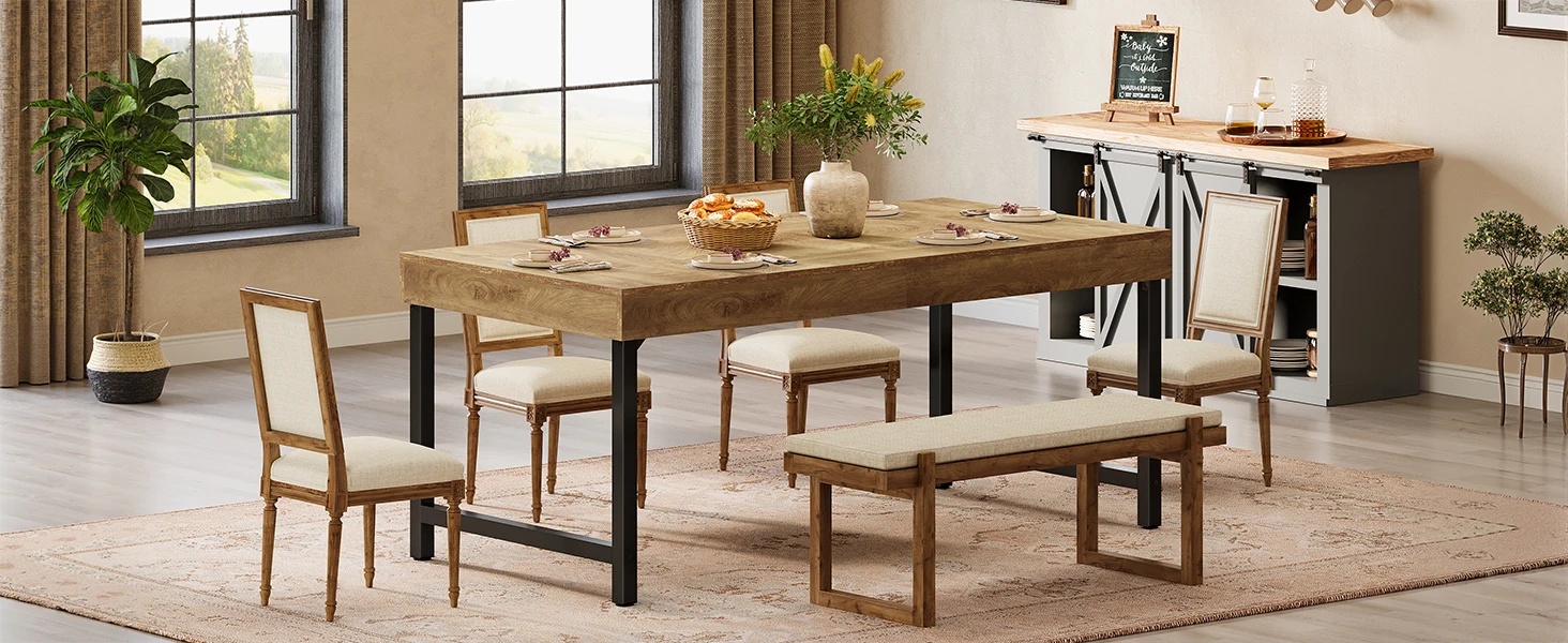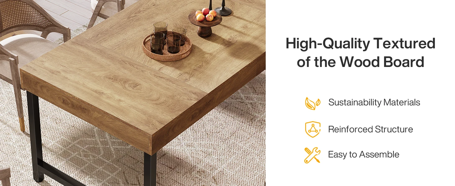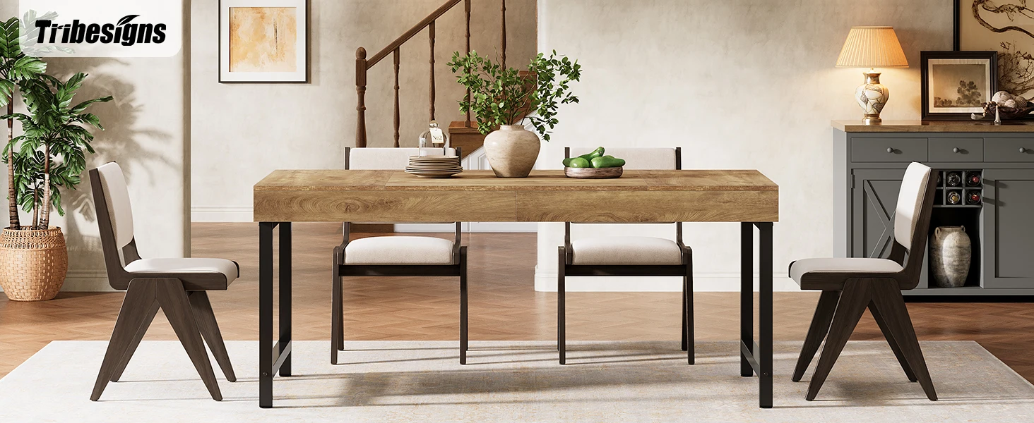 • Stylish Design: The rustic wooden finish of the dining table paired with sleek black metal legs creates a modern contrast, making it a perfect dining room table that effortlessly complements industrial, contemporary, or farmhouse decor styles