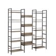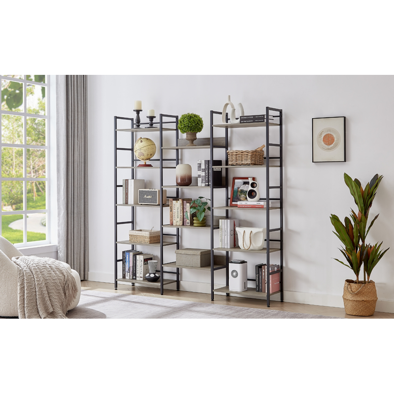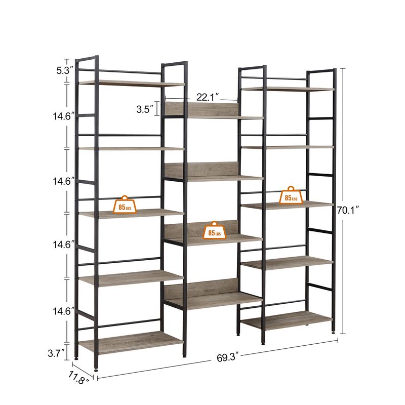 Triple Wide 5-shelf Bookshelves Industrial Retro Wooden Style Home and Office Large Open Bookshelves, Grey, 69.3\W x 11.8\D x 70.1\H