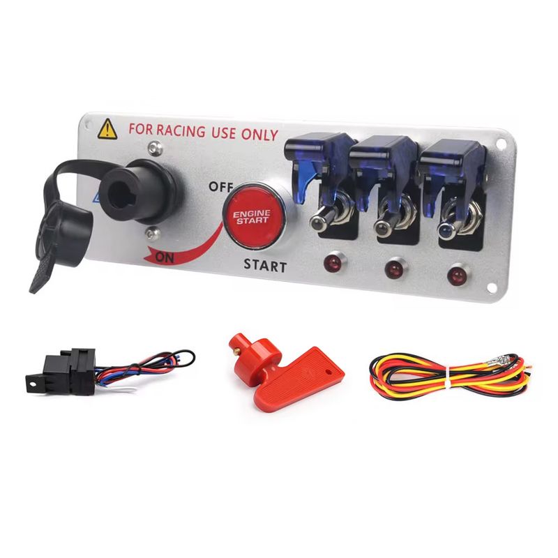 Red engine start button with 3 toggle switch for additional use.