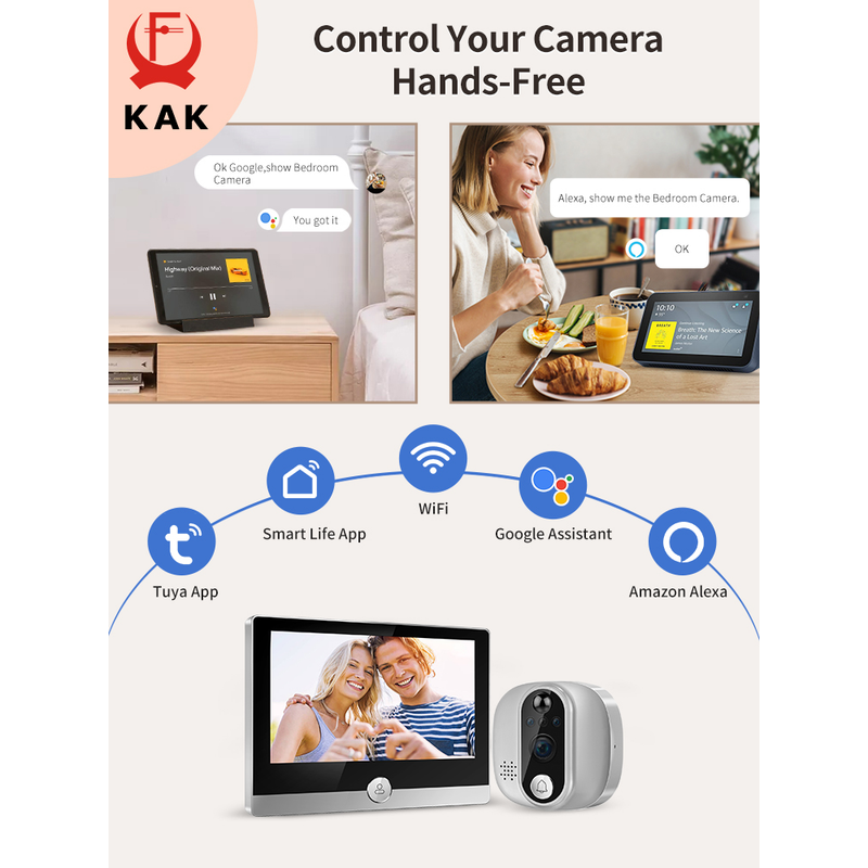 It can connect to WiFi router wirelessly. You can monitor (handheld including smartphones, Android tablets) and one or two-way intercom with noise reduction (view visitors, video calls, snapshots, recordings, etc.). The system function menu is located in the mobile APP console instead of the indoor display. (The device is widely used in homes, apartments, villas, hotels or offices, etc.).At the same time the large 4.3" LCD screen enables you or your family to see out the door clearly and sharply.