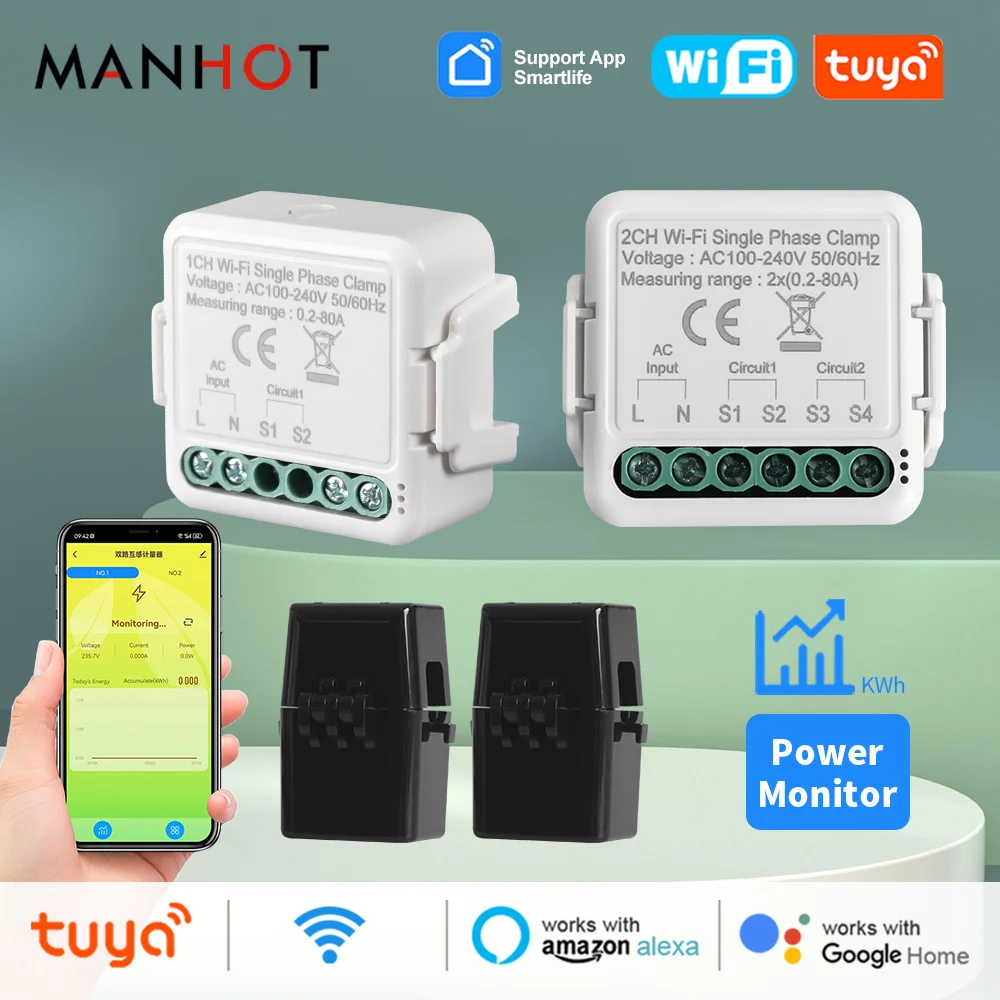 Tuya 80A WiFi Smart Single Energy Meter With Current Transformer Clamp App Monitor Power Meter Product Electric Consumption
