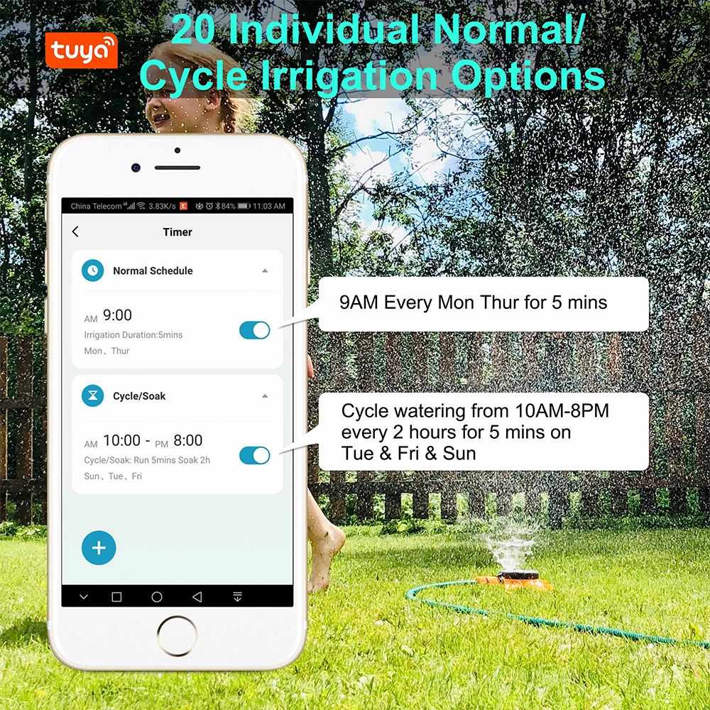 - Bluetooth/Wifi-compatible two-way independent control, suitable for lawn watering, potted drip irrigation, swimming pool water storage, atomization cooling, temporary watering and other scenarios. It supports ordinary single timed watering, and can also set cycle timed watering plan, manual weather delay, and can query watering records (if the mobile phone is not connected for a long time, the watering records may be lost).