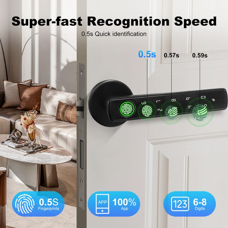 ●Quick unlocking:Fingerprint recognition is accurate and fast, and the door is instantly responded to with a touch of the fingertip, improving life efficiency.