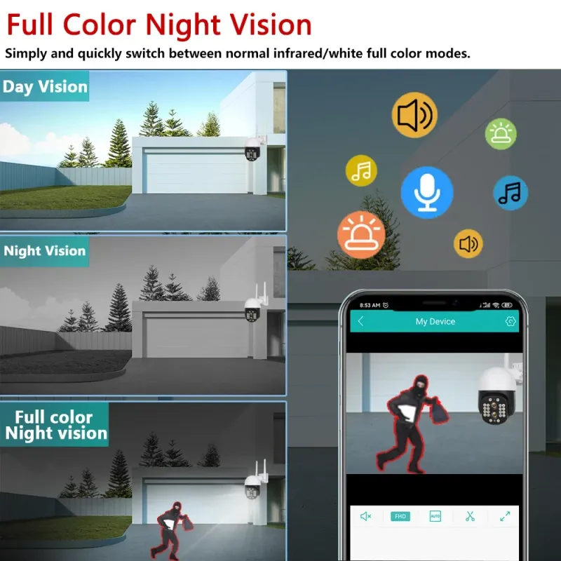 - Dual light source design, built-in infrared light + white light, night vision infrared and night vision full color can be set;