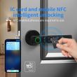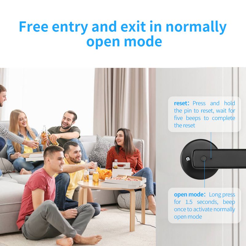 This smart door lock supports five unlocking methods. It features virtual passcodes and temporary passcode functionality. Remote unlocking via smartphone is enabled through a gateway. It supports always-open mode and simple reset.
