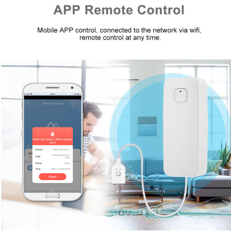 Mobile APP control, connected to the network via wifi, remote control at any time, you will receive a notification if there is a leak. IP67 waterproof water leakage detector probe. Wall-mounted, easy to use. Removable battery, easy for installation, low power consumption, energy-saving. You can share the device with your family.