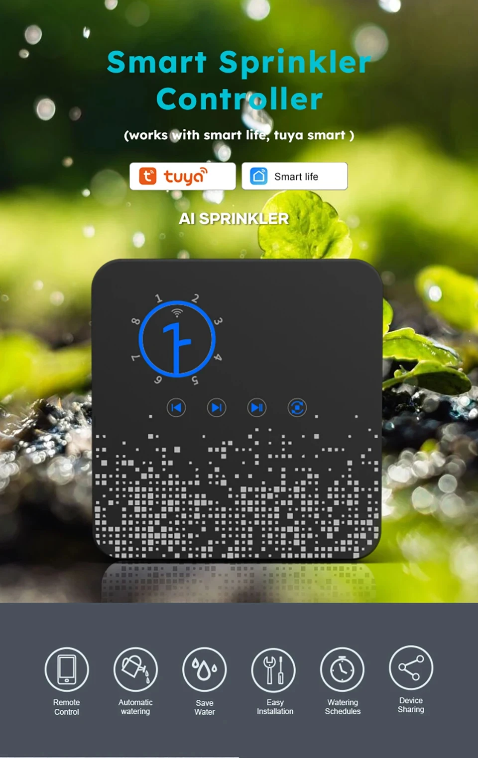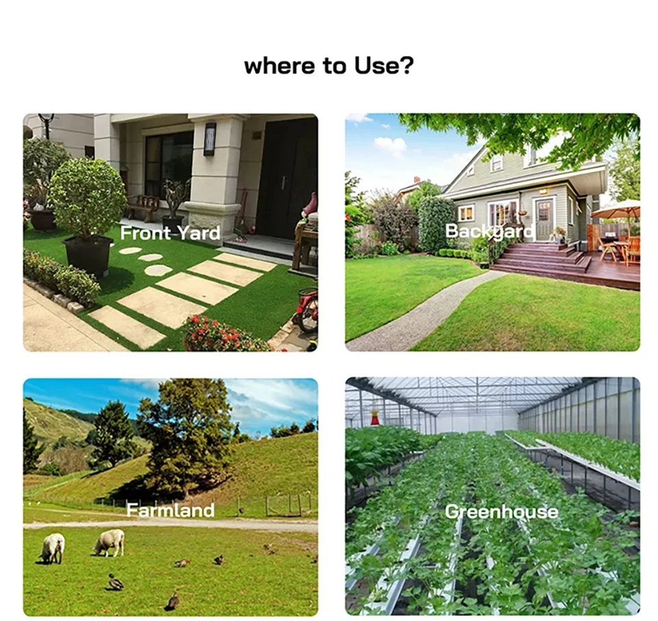 Intelligent sprinkler timer, remote controlling, easy to use, perfect for gardens, courtyards, lawns, farmland, greenhouses, etc. Support weather aware, it can cut off unnecessary watering, save water and money.