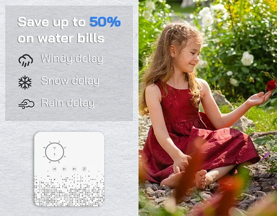 ✪ Weather Aware: The controller can automatically detect the weather status, skip the watering plan automatically on windy/rainy/snowy days, save water and money.