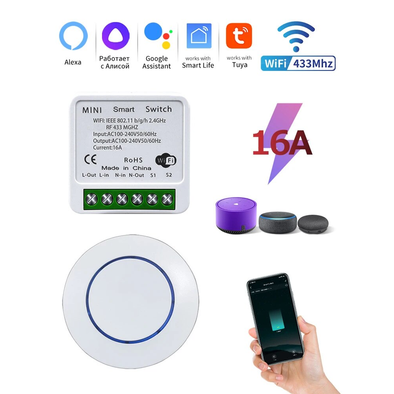 The relay controller is WiFi +RF433MHz, the wall switch is RF433MHz only. mini round button switch itself cannot control lights on off. It needs to work with WiFi +RF433MHz receiver together.