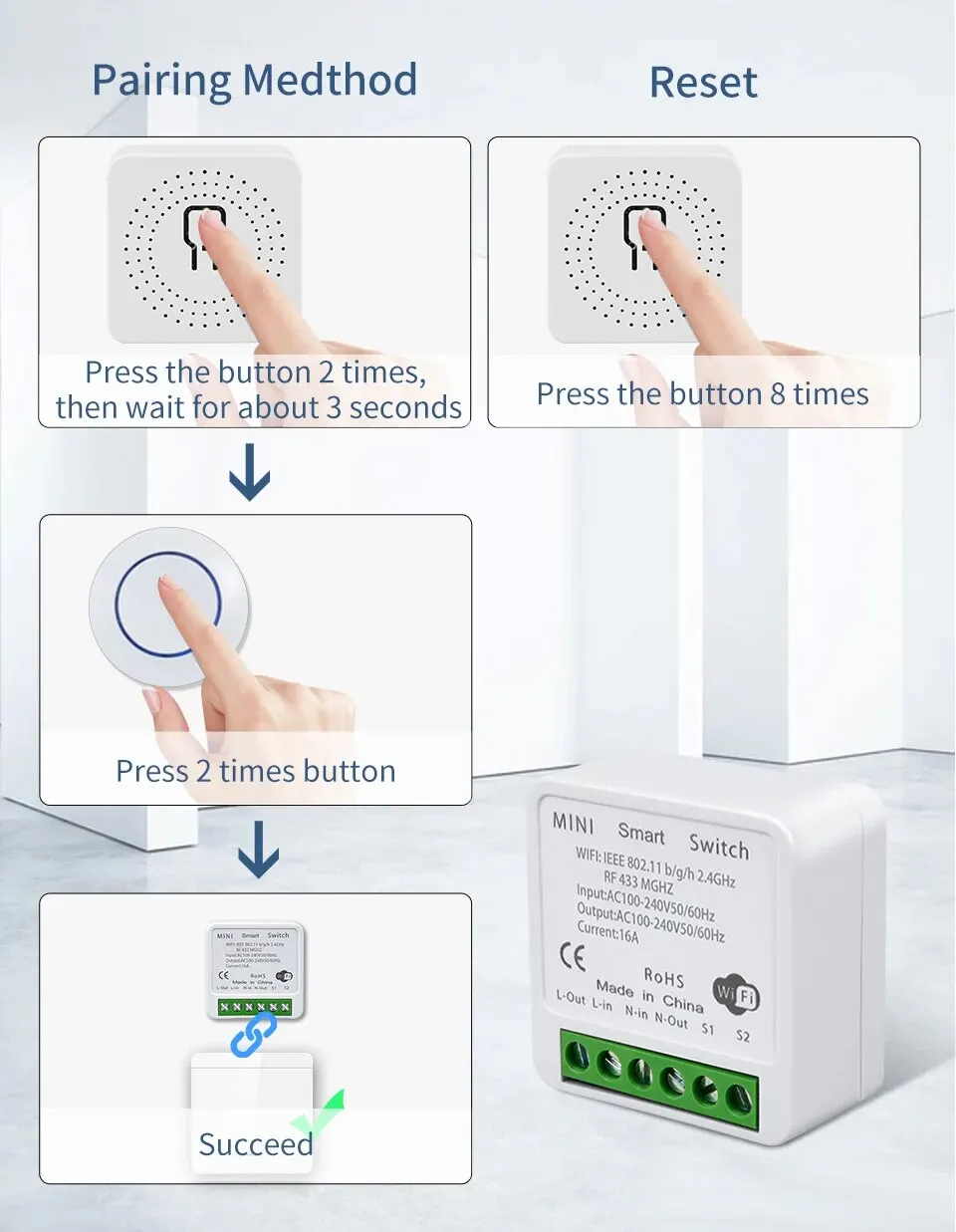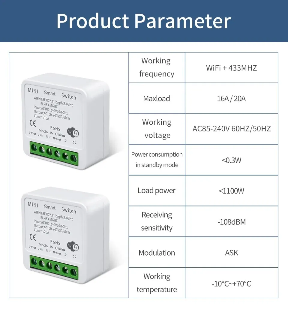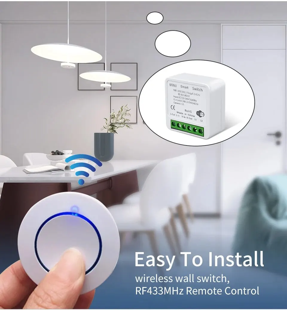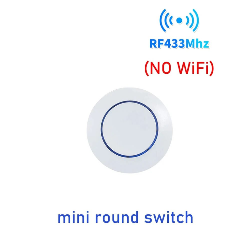 The relay controller is WiFi +RF433MHz, the wall switch is RF433MHz only. mini round button switch itself cannot control lights on off. It needs to work with WiFi +RF433MHz receiver together.