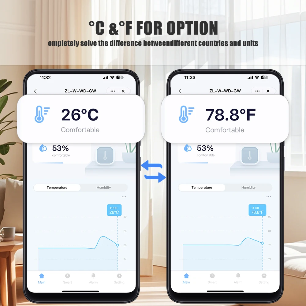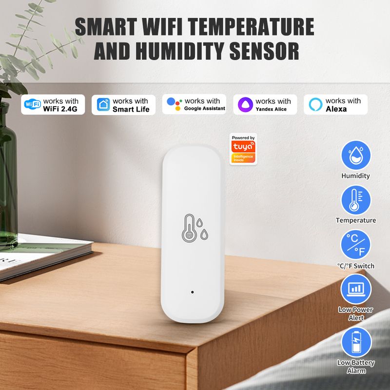 Supports 2.4G WiFi connectivity for real-time remote monitoring of temperature and humidity data, featuring high/low threshold alerts. Compatible with other smart devices for integrated control. Suitable for diverse environments with adjustable temperature units. Delivers high precision, extended battery life, and low-power alerts.