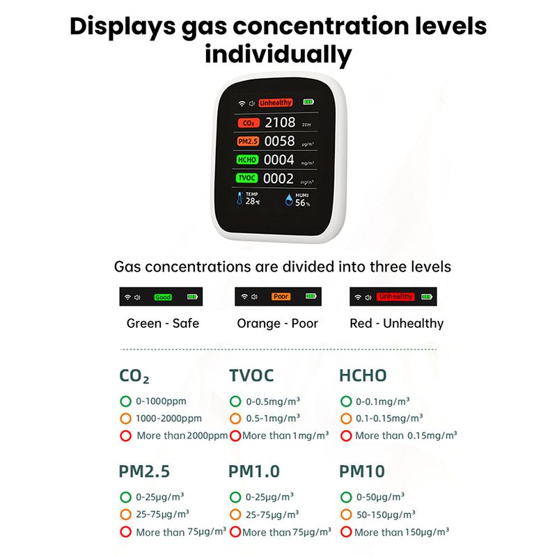 1. Change the color according to the concentration of carbon dioxide. When the carbon dioxide value reaches 1500ppm, an alarm sound will be triggered.